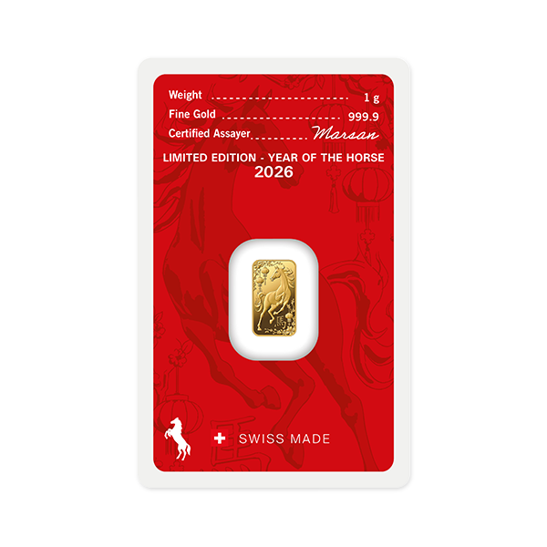 Auf der Rückseite des Goldbarrens sind das Logo von Argor-Heraeus, die Aufschrift „Switzerland“, das Feingewicht „1 g“, die Metallart „Fine Gold“, der Feingehalt „999,9“, das Prüfzeichen sowie eine eindeutige Seriennummer zu finden, die die Rückverfolgbarkeit des Barrens garantiert. Jeder Barren „Jahr des Pferdes 2026” entspricht strengsten Schweizer Standards und gewährleistet somit einwandfreie Qualität und optimale Sicherheit.