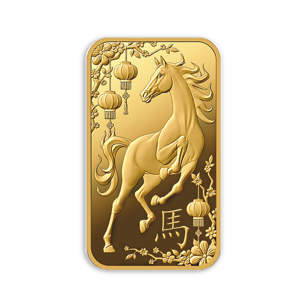 Auf der Vorderseite zeigt der Barren ein majestätisches Pferd in voller Bewegung, umgeben von Motiven, die Feierlichkeit und Erneuerung symbolisieren. Die Feinheit der Prägung unterstreicht die Dynamik und Noblesse des Feuerpferdes und weist eine raffinierte Ästhetik auf, die perfekt zum kompakten Format von 1 Gramm passt.