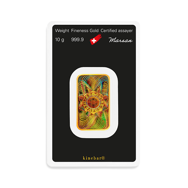 Der 10-Gramm-Kinebarren aus reinem Gold von Argor-Heraeus vereint somit maximale Sicherheit, Schweizer Prestige und optische Schönheit und ist damit ein Muss für jeden Edelmetallinvestor.