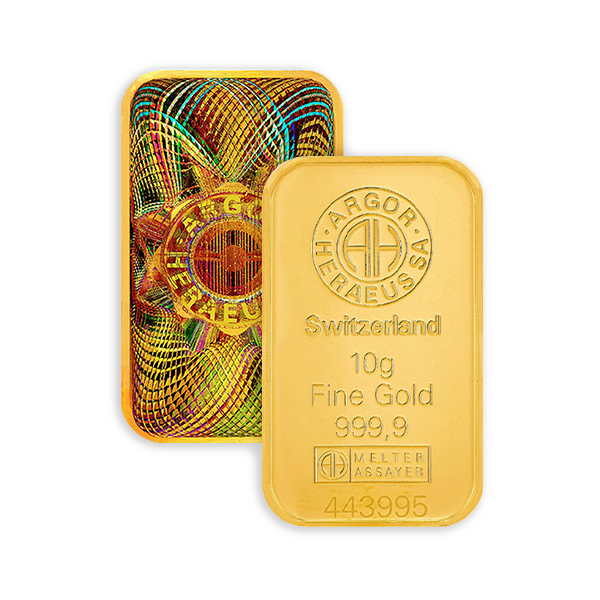 Die Vorderseite des Barrens zeigt das Logo von Argor-Heraeus, die Aufschrift „Switzerland“, sowie die Angaben zu Gewicht, „10 g“, Metallart, „Fine Gold“ und Feingehalt, „999,9“. Zudem sind das Prüfzeichen und eine eindeutige Seriennummer eingeprägt, die die Rückverfolgbarkeit und Echtheit garantiert.