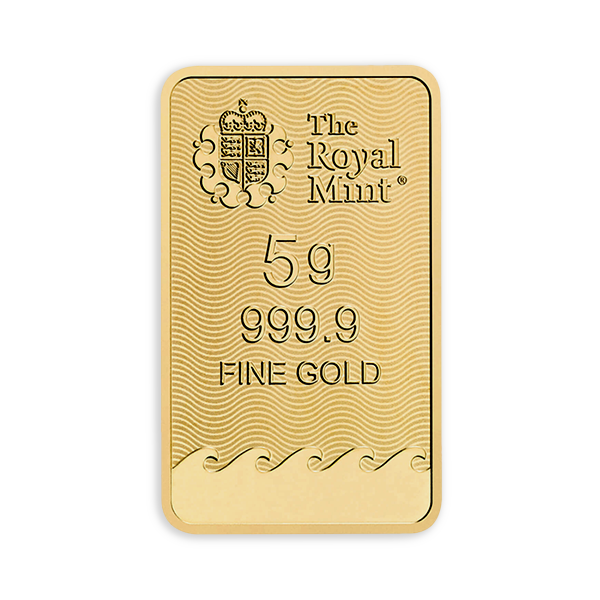 Die Vorderseite des Barrens zeigt die majestätische Figur der Britannia, entworfen von Jody Clark, mit einem korinthischen Helm auf dem Kopf, einem Dreizack und einem Schild, auf dem die britische Flagge „Union Jack“ prangt. Der Hintergrund erinnert an Wellenmuster, eine Anspielung auf die maritime Geschichte des Vereinigten Königreiches. Die Rückseite zeigt das Logo der Royal Mint, begleitet von der Gewichtsangabe „5 g“, dem Feingehalt „999.9“ und der Metallangabe „fine gold“, umgeben von einem weiteren Wellenmotiv, das für ein raffiniertes und harmonisches Erscheinungsbild sorgt.