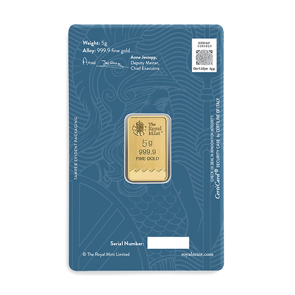 Mit dem Kauf eines Britannia-Goldbarrens zu 5 Gramm investieren Sie in die Zuverlässigkeit, die internationale Anerkennung und das Ansehen der Royal Mint.