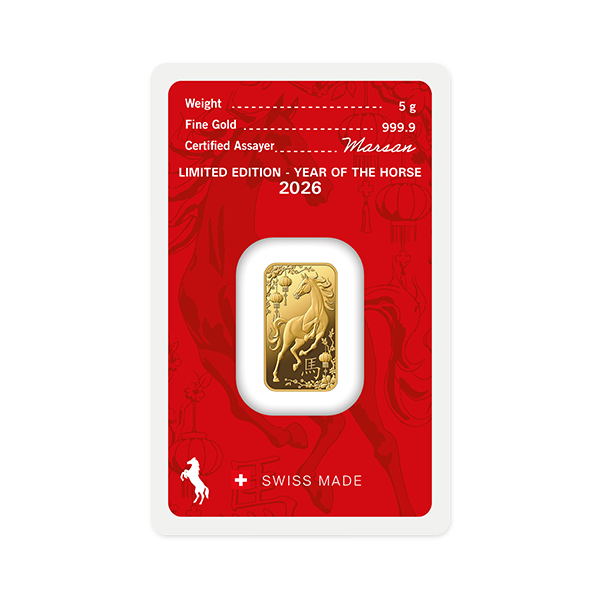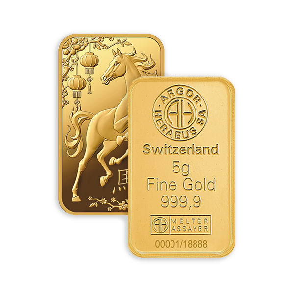 Der Goldbarren „Jahr des Pferdes 2026” zu 5 Gramm von Argor-Heraeus feiert den Beginn eines neuen Zyklus im Zeichen des Feuerpferdes, einem der seltensten und mächtigsten Symbole des chinesischen Mondkalenders. Dieses Zeichen steht für Energie, Kühnheit, Unabhängigkeit und Vitalität und verkörpert innere Stärke und stetige Erneuerung – Werte, die in diesem Barren in limitierter Auflage wunderschön zum Ausdruck kommen.