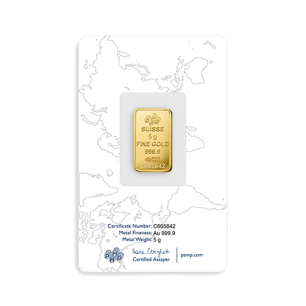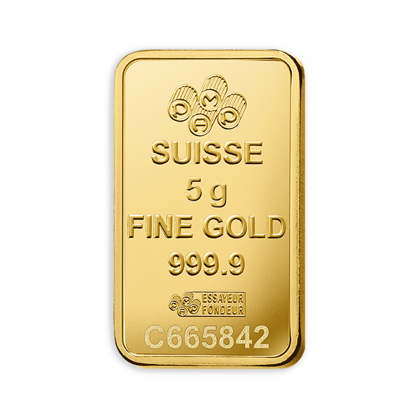 Die Rückseite zeigt das PAMP-Logo, die Aufschrift „Suisse”, das Gewicht „5 g”, die Metallart „Fine Gold”, den Feingehalt „999,9”, den offiziellen Prüfstempel, sowie eine einmalige Seriennummer, die die Echtheit und Rückverfolgbarkeit des Barrens garantiert.