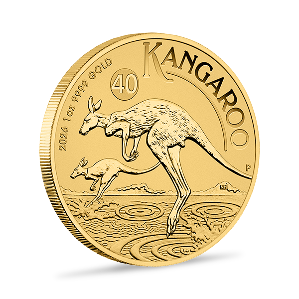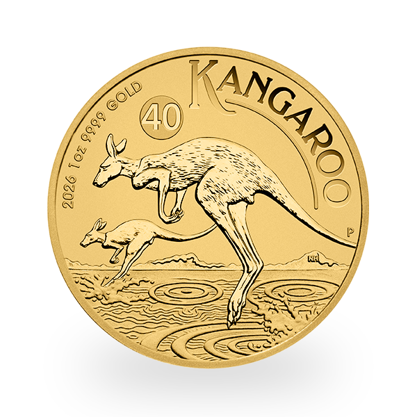 Die Rückseite der Münze zeigt 2026 eine Darstellung von zwei Kängurus, die leichtfüßig über ein Gewässer springen. Sich kräuselnde Wellen, Wasserspritzer und eine weit entfernte Berglandschaft im Hintergrund runden das Motiv ab. Die Zahl „40” ist eine Hommage an das 40-jährige Jubiläum der Münze „Australian Nugget“, der ersten offiziellen Serie von Goldmünzen, die in Australien als gesetzliches Zahlungsmittel gelten. Auf dieser Münzseite sind darüber hinaus der Schriftzug „KANGAROO”, das Prägezeichen „P” der Perth Mint sowie die Angaben „1 oz”, „9999”, „GOLD” und das Prägejahr „2026” zu lesen.