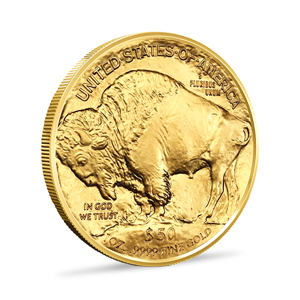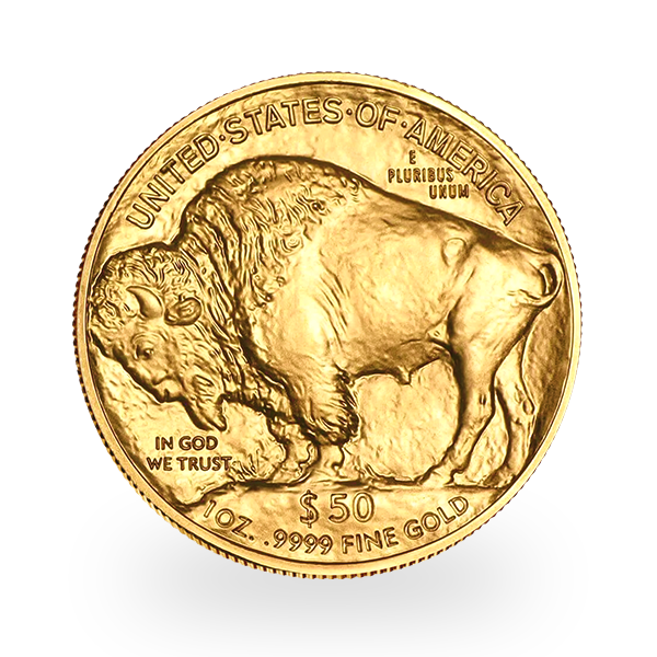 Die Rückseite zeigt den majestätischen amerikanischen Büffel – oder Bison – der auf einem Erdhügel steht. Er ist umgeben von den Schriftzügen „UNITED STATES OF AMERICA”, „E PLURIBUS UNUM” („Aus vielen eins”), „IN GOD WE TRUST” sowie dem Nennwert „$50”, dem Gewicht „1 OZ” und dem Feingehalt „.9999 FINE GOLD”.