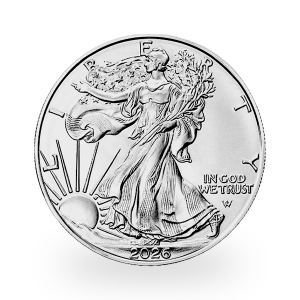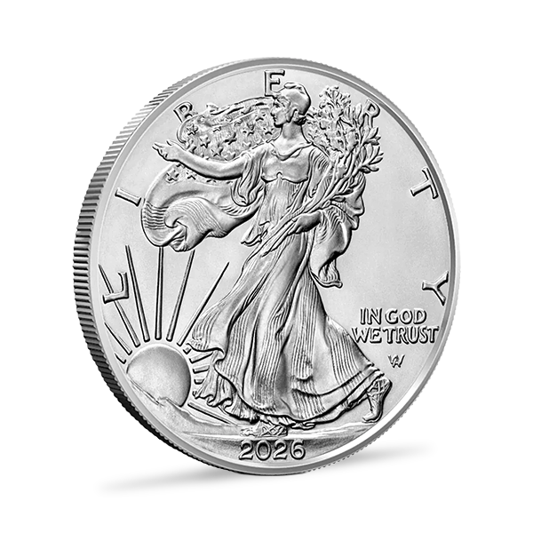 Die Vorderseite der 1-Unzen-Münze zeigt die ikonische Darstellung der Lady Liberty von Adolph A. Weinman, die selbstbewusst dem Sonnenaufgang entgegengeht. In die amerikanische Flagge gehüllt, streckt sie ihre rechte Hand aus, während sie in der linken Hand Lorbeer- und Eichenzweige hält. Der Schriftzug „LIBERTY” prangt über dem Motiv, das Prägejahr „2026” ist am unteren Rand der Münze abzulesen und das Motto „IN GOD WE TRUST” („Wir vertrauen auf Gott”) erscheint auf der rechten Seite.